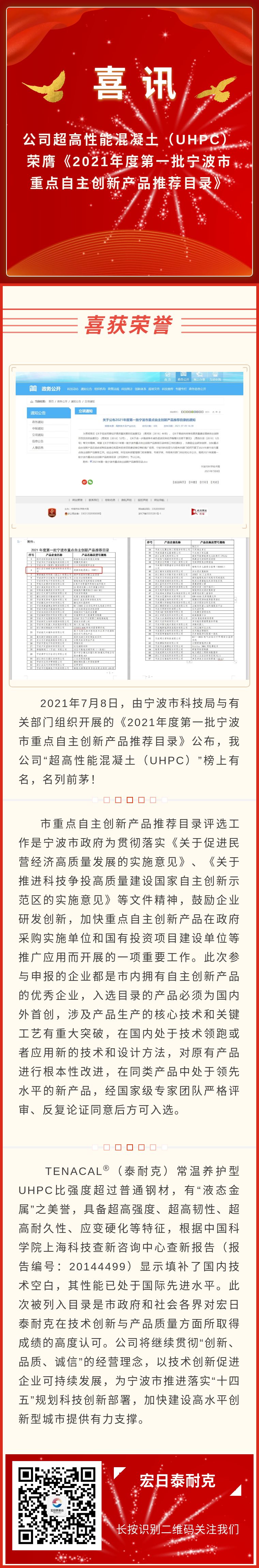 喜訊!公司超高性能混凝土(UHPC)榮膺《2021年度第一批寧波市重點自主創(chuàng)新產(chǎn)品推薦目錄》